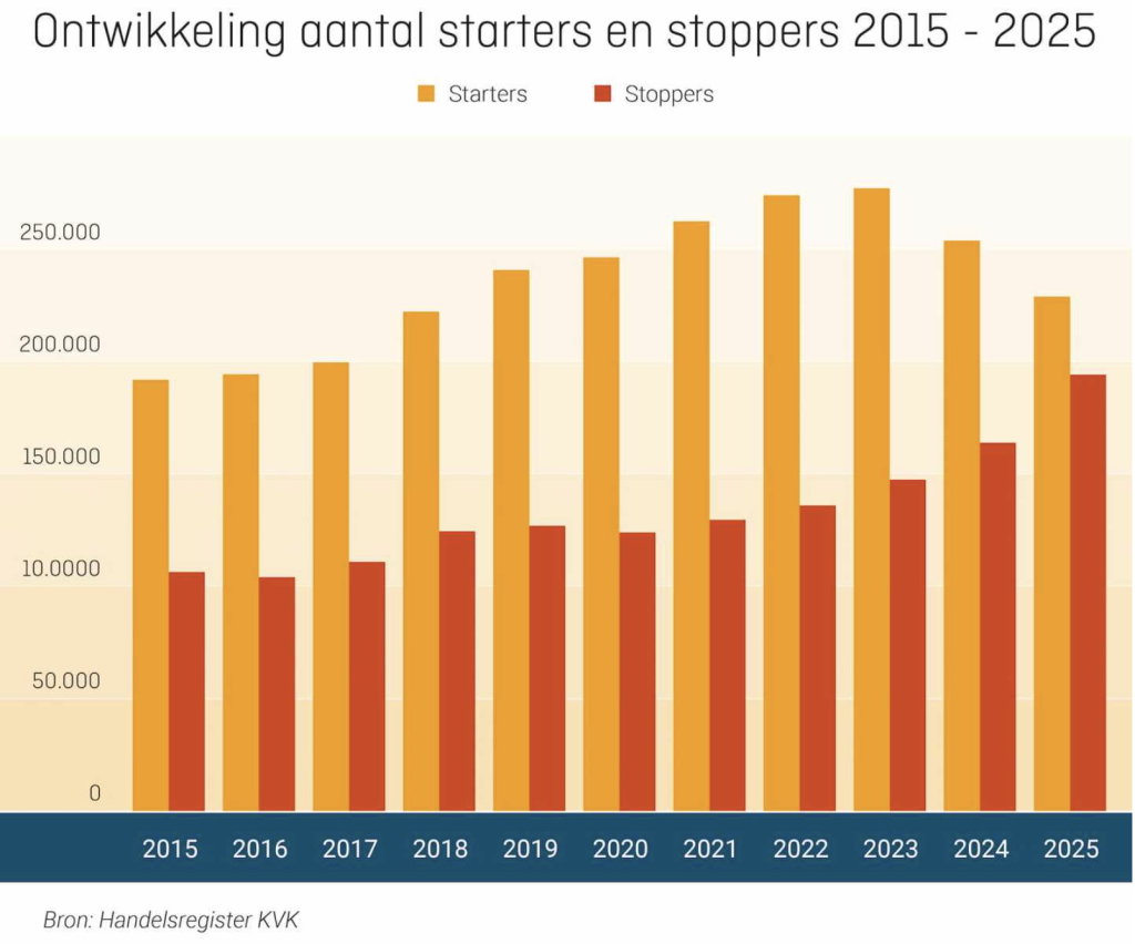De bedrijvenpopulatie lijkt hiermee onder druk te staan, concludeert de KVK: het aantal starters daalde in 2025 met 10 procent in vergelijking met 2024, terwijl het aantal stoppers met 18 procent steeg. In alle sectoren nam het aantal opheffingen toe. Vooral binnen de groep zzp’ers was het aantal stoppers opvallend hoog. Het aantal nieuwe zzp’ers daalde met 13 procent.